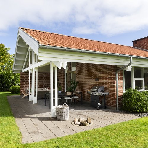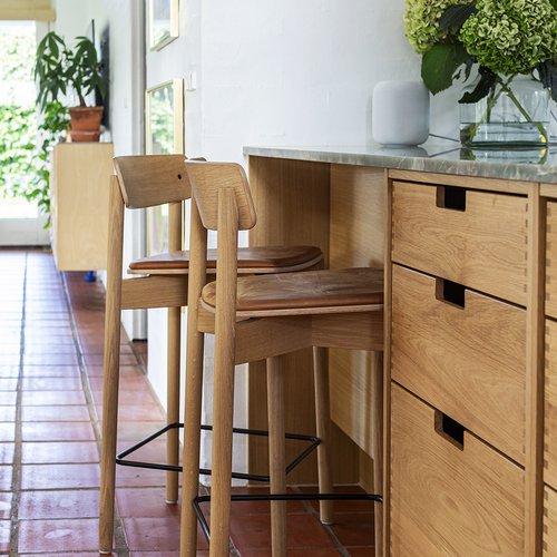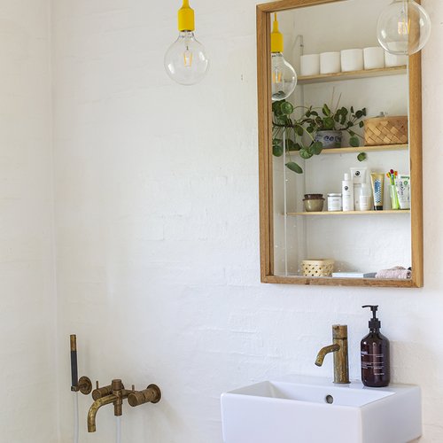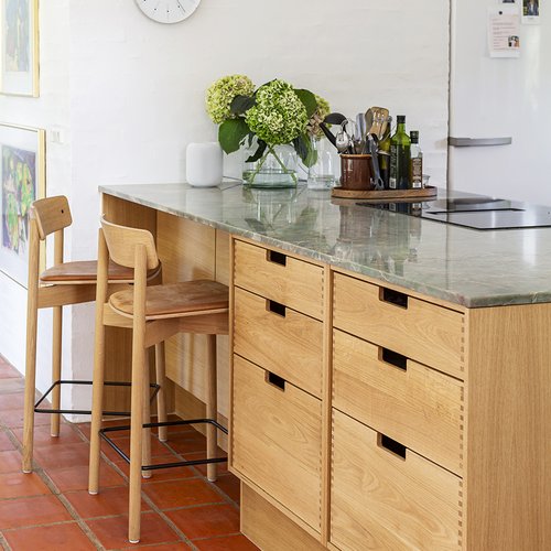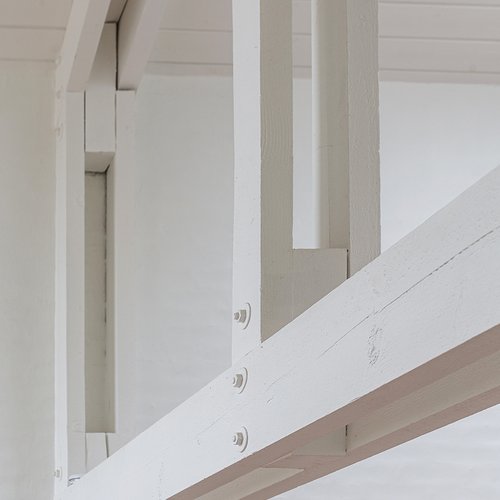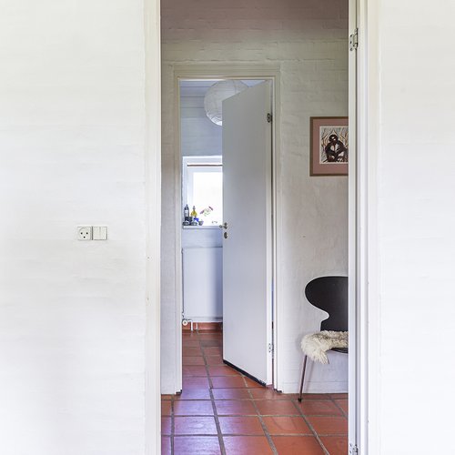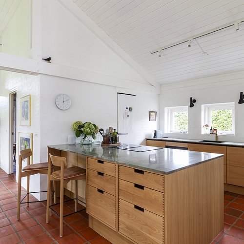 Køkken, bryggers og badeværelser er opdateret med ærlige, holdbare materialer som eg, natursten og porcelæn. Armaturer i messing og fingertappede snedkerdetaljer spiller sammen med husets synlige spær og rå karakter.