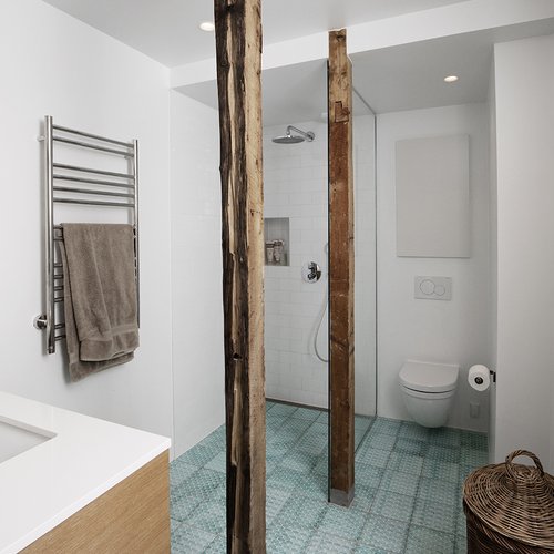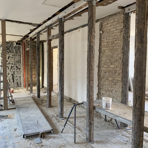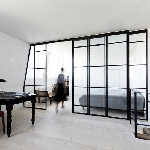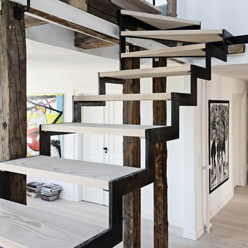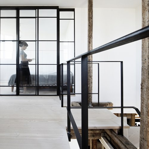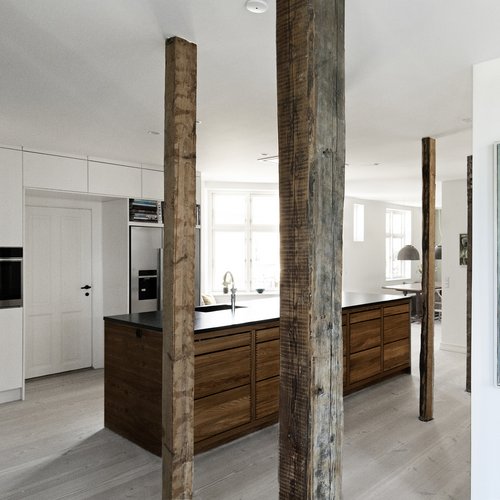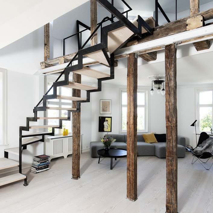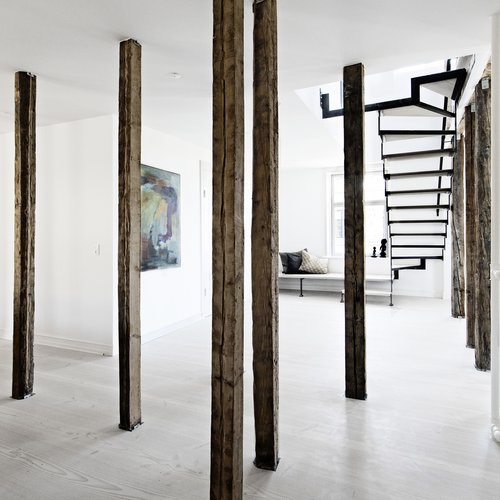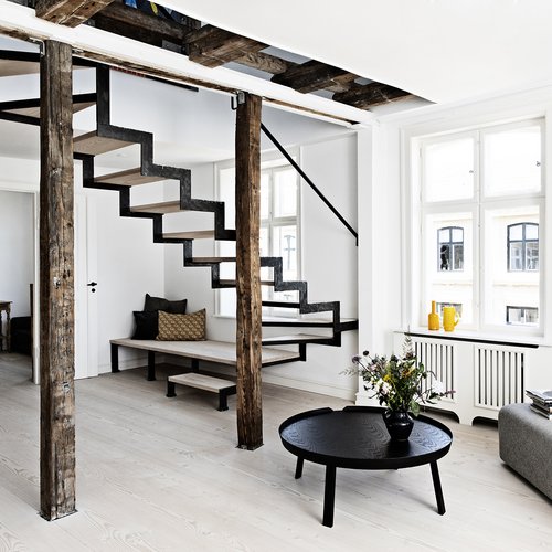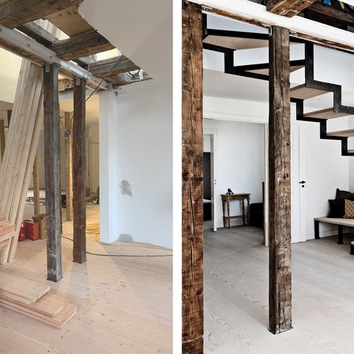 Vi valgte at fjerne fordelingsgangen. Her trådte de gamle traditionelle bindingsværksstolper frem. De stod som en stolt skov - de blev ikke blot bevaret, men de bærende konstruktioner blev også definerende for hele projektets udtryk. De står nu åbent og råt i lejligheden og skaber en rytme og sammenhæng i hele boligen. Det smukke loft og lyset ovenfra blev via et dobbelthøjt rum integreret i stuen. Med en let og skulpturel trappe bliver de to etager syet sammen, og dagslyset strømmer ind. Som en betydelig detalje er det første trin foldet ud til en bænk, der med kombinationen af sit rå smedejern som kant og det bløde, varme trægulv inviterer til en sanselig og rolig oplevelse.