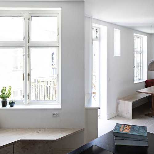 En transformation af en ældre lejlighed med respekt for kulturarv og nye behov. Lejligheden havde de oprindelige vinduer med trukket glas, disse blev bevaret og restaureret. Den oprindelige planløsning var præget af en mørk fordelingsgang med en perlerække af små tilstødende rum. Gangen afskar lejligheden fra både lys og udsigt. Samtidig gemte lejligheden på et loftrum og en skjult kvalitet i form af søjler i væggene.