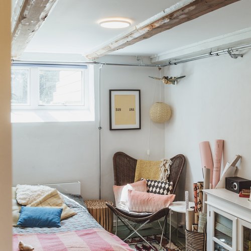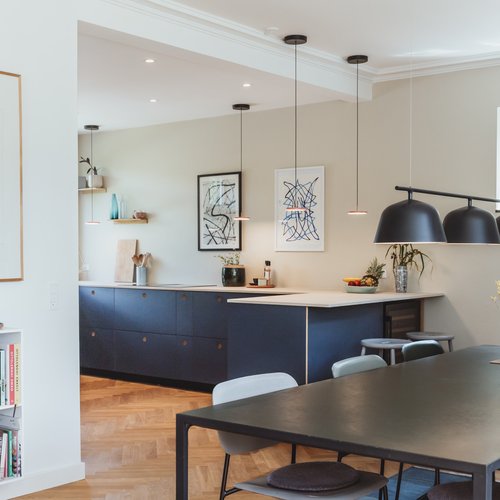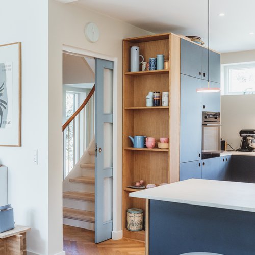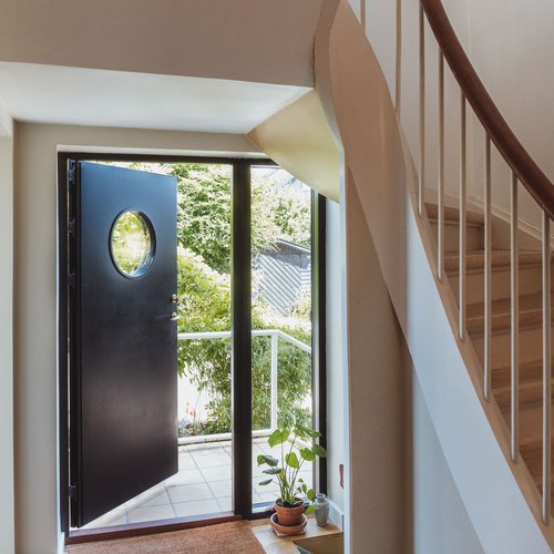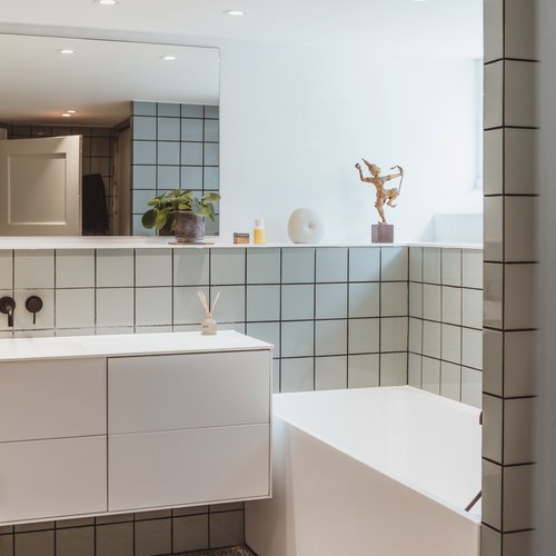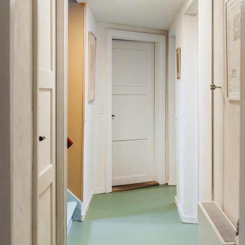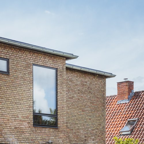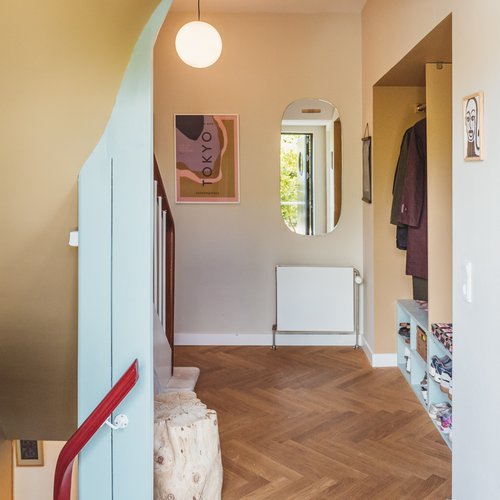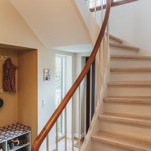 Ift. valg af materialer og detaljer lagde vi stor vægt på at skabe en rød tråd til husets identitet og funkisperioden. De originale trægulve blev bevaret på bekostning af gulvvarme, de indvendige døre og fodpaneler blev renoveret og genmonteret, og på det oprindelige badeværelse på 1. sal blev terrazzogulv og vægfliser ligeledes bevaret, men saniteten udskiftet. Det store, blyindfattede vindue i trapperummet, som er så karakteristisk for perioden, blev bevaret, men der blev monteret et lavenergivindue udvendigt for at mindske varmetabet. Generelt fik huset nye installationer overalt til både vand og varme, taget blev efterisoleret og vinduerne udskiftet. På den baggrund kan huset leve mange år fremover.