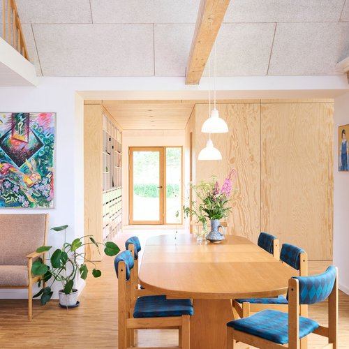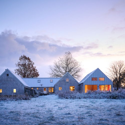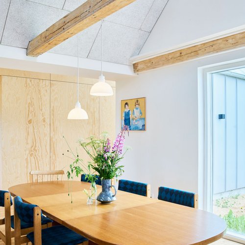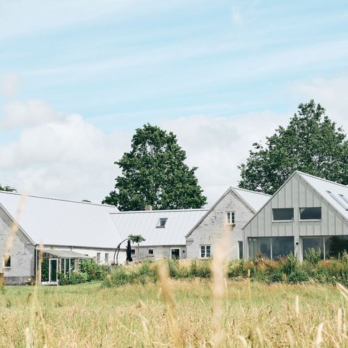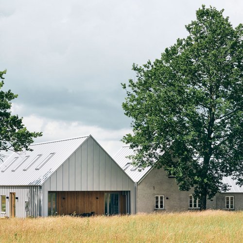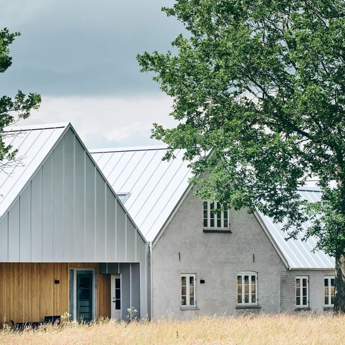 Det oprindelige stuehus er blevet gennemgribende renoveret og rummer nu både bolig og atelier. I forlængelse heraf har vi opført en ny tilbygning, som i form og proportioner gentager den klassiske længebygning, men med en moderne fortolkning. Det velkendte ståltag er tænkt videre som både tag og facade, hvilket skaber en helhed og karakteristisk identitet for huset.