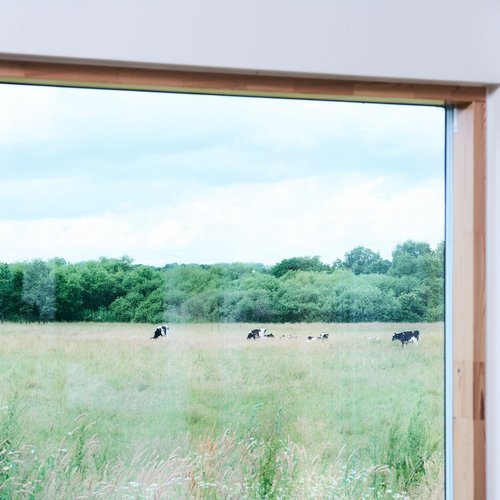 I gavlene har vi indsat store vinduespartier, der åbner huset op mod landskabet og inviterer naturen helt ind i hjemmet. På den måde skaber arkitekturen både lys, luft og nærvær til omgivelserne.