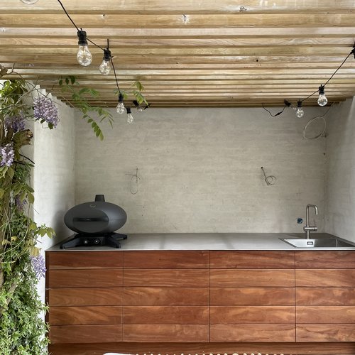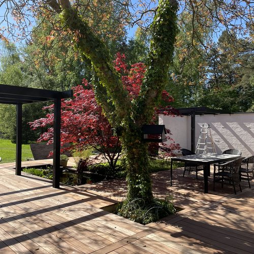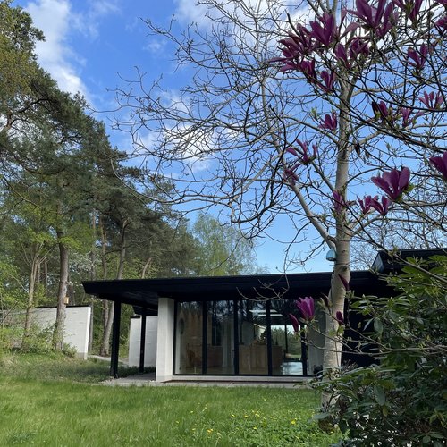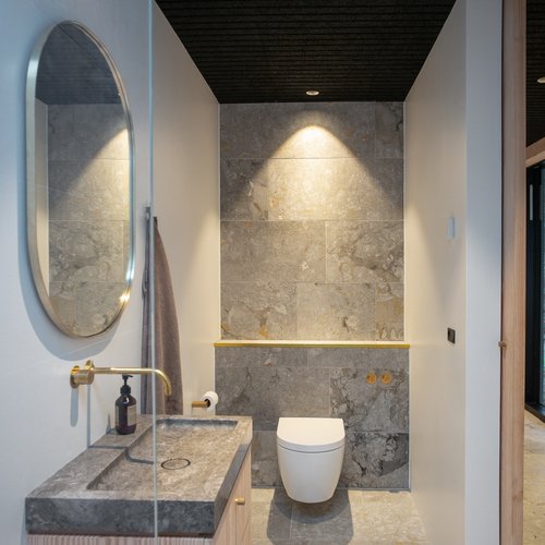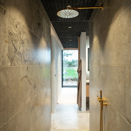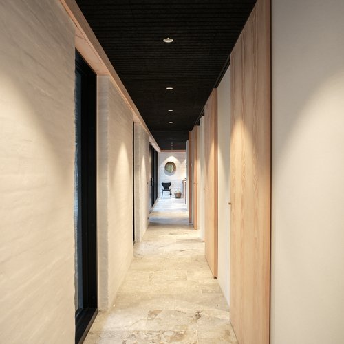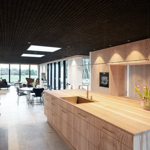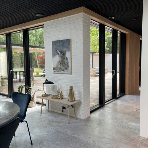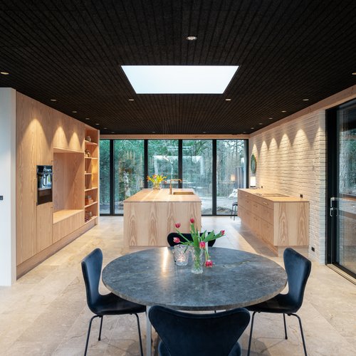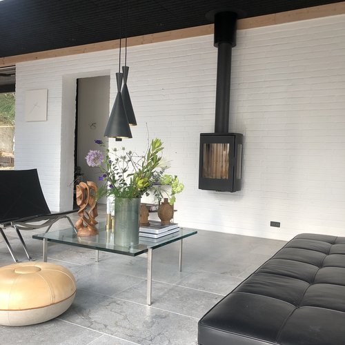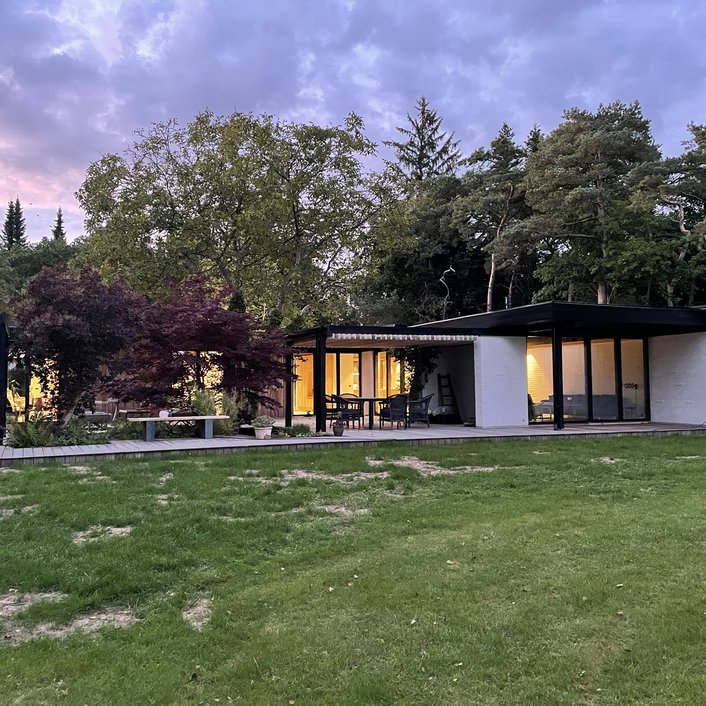 Vi har tilført huset få enkle men eksklusive og gennemgående materialer, som skaber ro og sammenhæng hele vejen igennem huset, så det kan holde de næste mange generationer. Med respekt for arkitekturen og husets oprindelige linjer er der åbnet op imod naturen i alle verdenshjørner og de omkringliggende træer og åbner vidder trækkes ind i boligen. Der er taget udgangspunkt i arkitekt Niels Blinkenbergs tanker og visioner for huset, som oprindeligt blev bygget i 1964. Arkitekt Bruno Jakobsen har videreført husets vision, så det matcher nuværende behov.