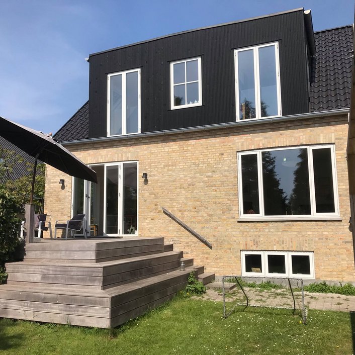 Tilbygning af bungalow (ny førstesal) udført i træ og med brug af genbrugsmursten