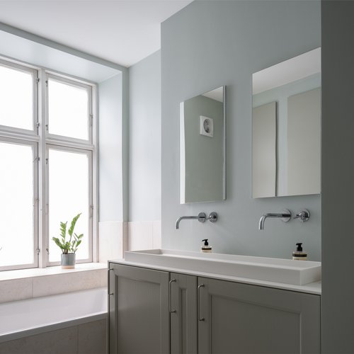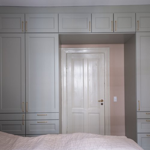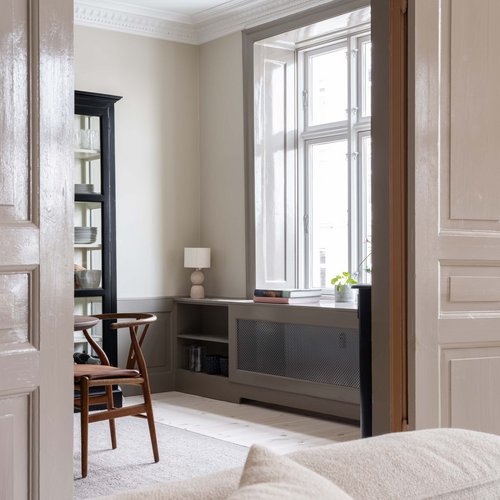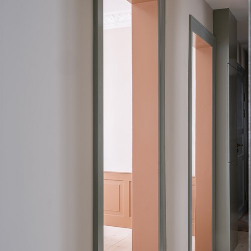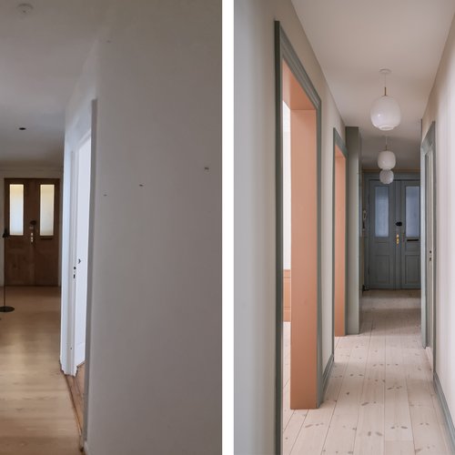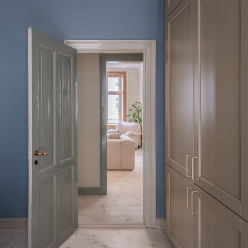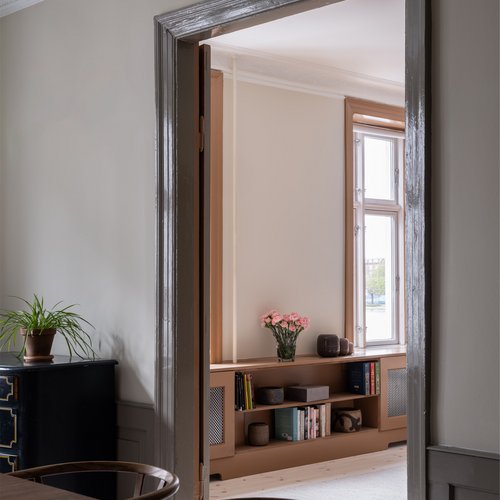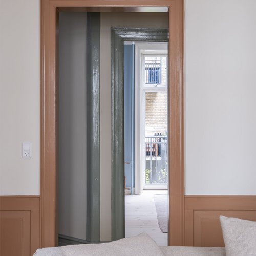 Hvert af lejlighedens rum har vi givet sin egen farve. Gennem en afstemt farvepalet understreges rummenes unikke karakter, og farverne skaber forskellige stemninger. Dørkarmene og panelerne er tonet mørkere, mens dørbladene er lysere for at danne en flydende overgang mellem rummene og byde de næste rum velkommen. Dette skaber stemning og giver en rumlig variation uden at kræve store indgreb i planløsningen.