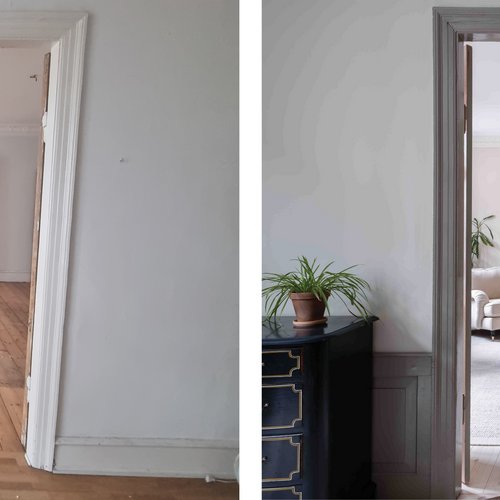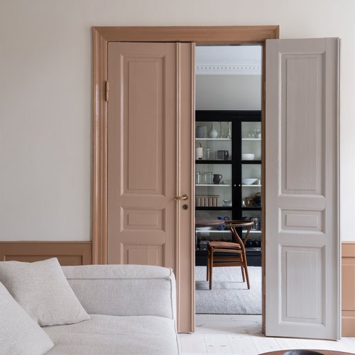 De oprindelige tofløjede døre, der forbinder stuerne, er bevaret, renoveret og malet i en lys nuance, som både respekterer fortiden og skaber visuel sammenhæng i rummene De høje paneler har vi genskabt og tilpasset husets ånd og originale døre.