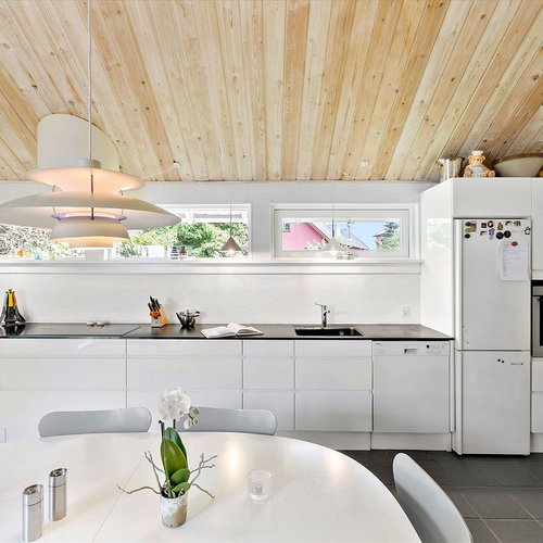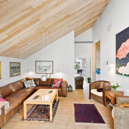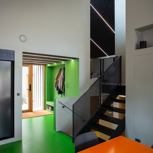 Inde i huset gemmer der sig en usædvanlig fin kontakt mellem de forskellige niveauer og rum i boligen. Stue og soveværelse ligger en halv etage over indgangsetagen med entre, bryggers og køkken-alrum, mens de tre børneværelser ligger en halv etage nede. De forskudte planer er knyttet sammen med et åbent trappeforløb der binder niveauer sammen.