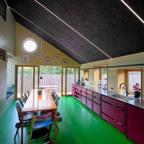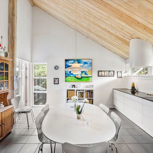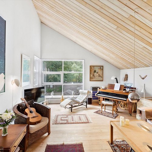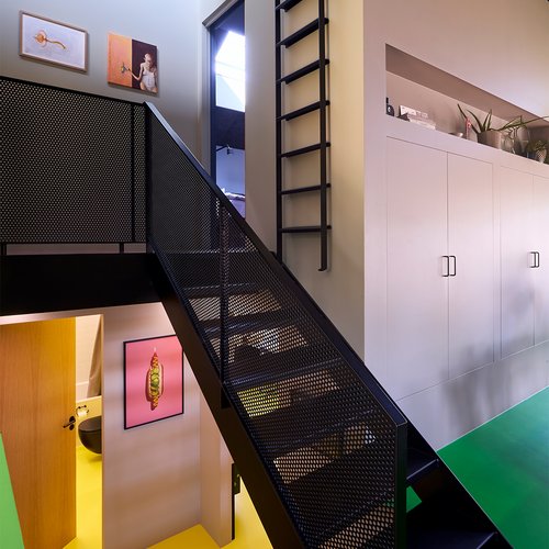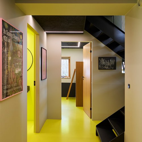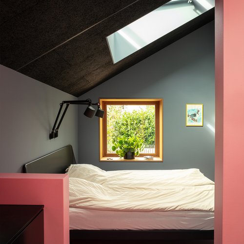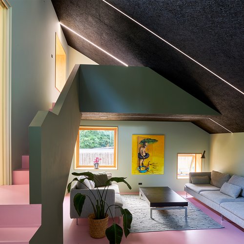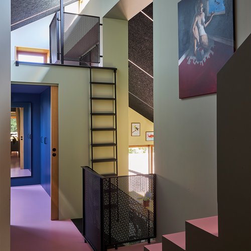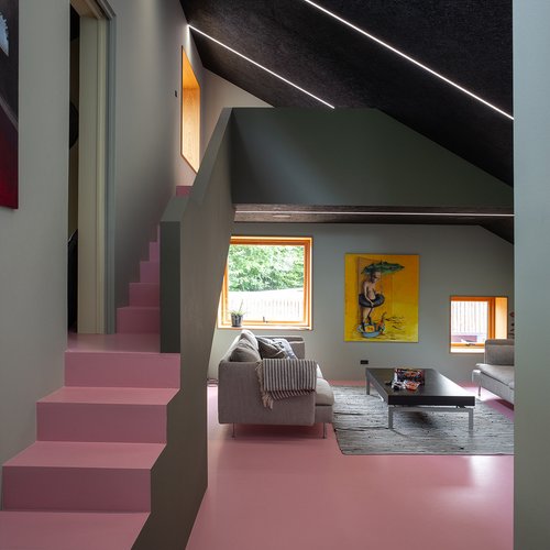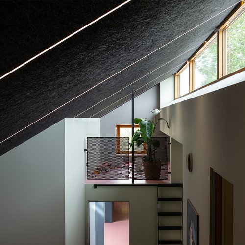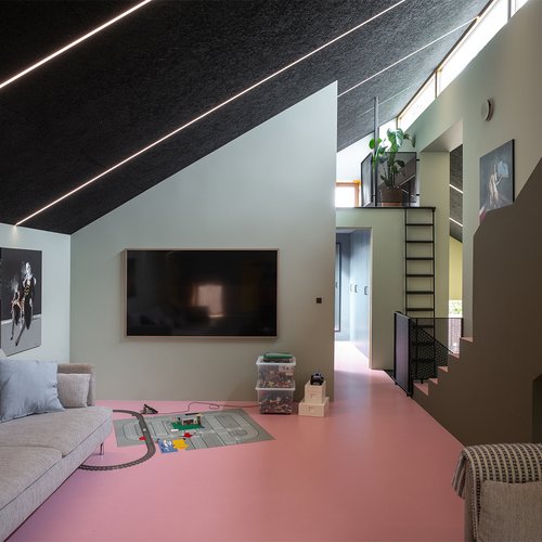 Denne oprindelige dynamik er der bygget videre på ved at indrette flere forskudte hemse og små rum i overetagen, der har loft til kip. Derudover er der etablerede nye højtsiddende vinduer ved kip der giver mere lys ned gennem etagerne.