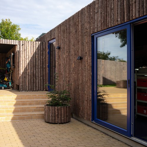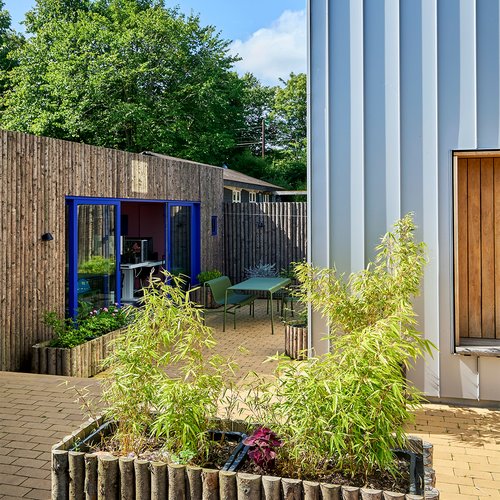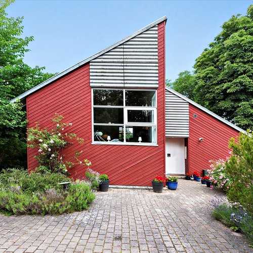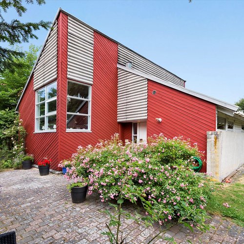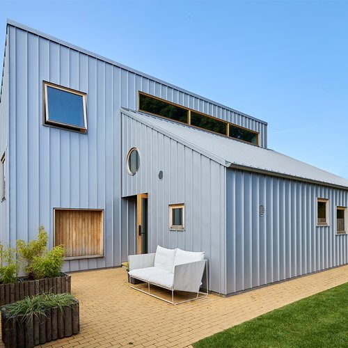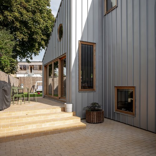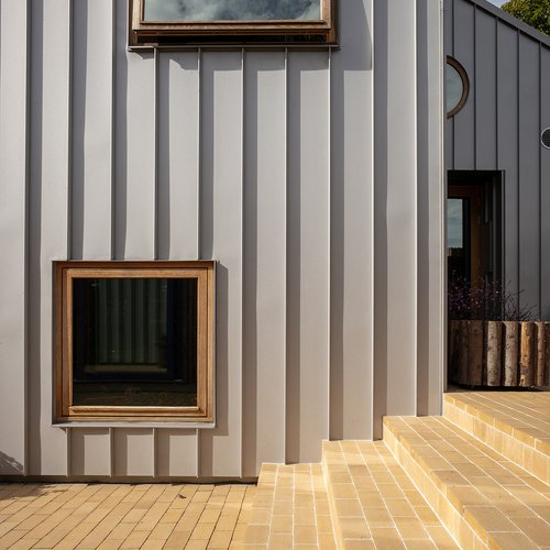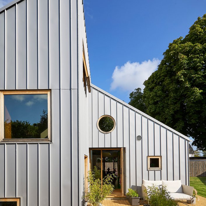 Et stilrent ydre med ens stålgrå stål falsplader på både facade og tag. Naturolierede egetræsvinduer som en varm kontrast til stålpladerne. Legende vinduesplaceringer for både det gode kig og lysindfald. Udearealer er belagt med klassiske gule teglmursten. Et fint samspil mellem rå og varme materialer. Et plankeværk der ikke bare blev et plankeværk, men også en beklædning på garagen for at skabe sammenhæng og naturlige overgange.
