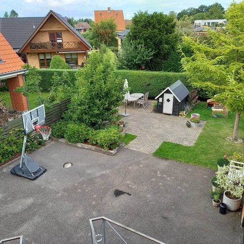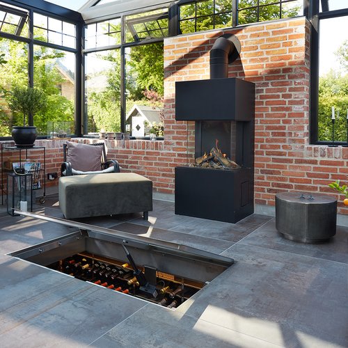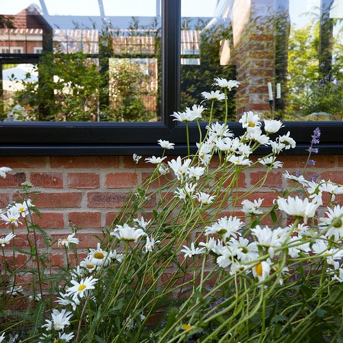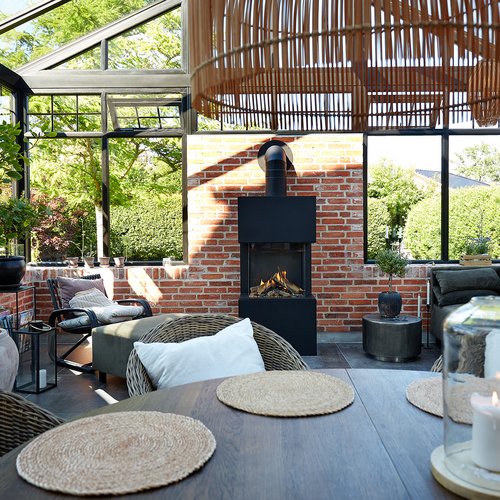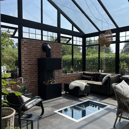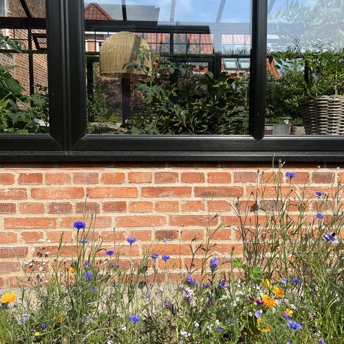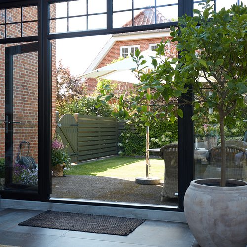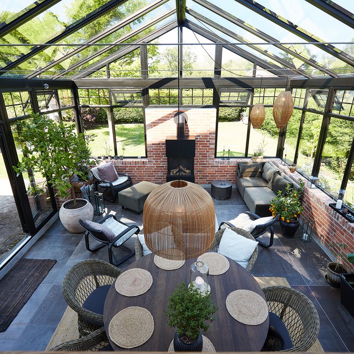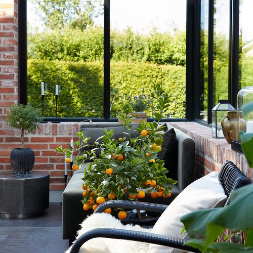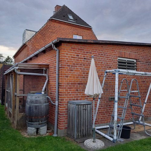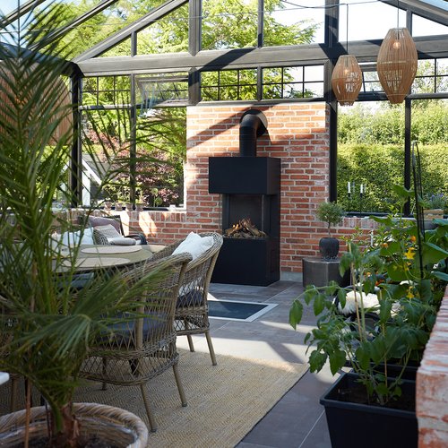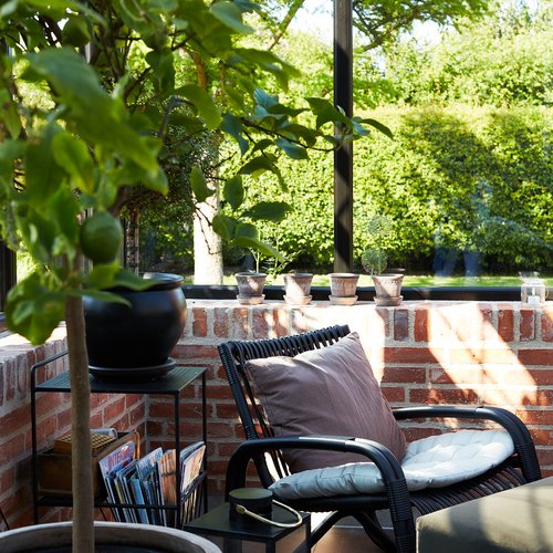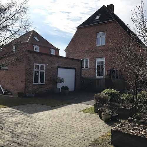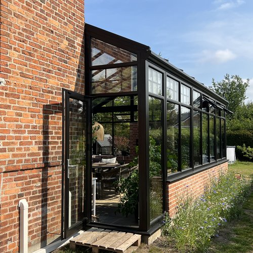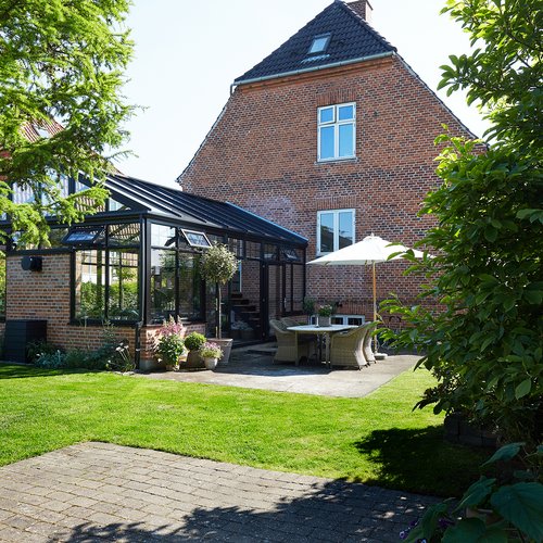 Transformationen er sket i aftrykket af 2 tidligere sammenbyggede udhuse, som nu er erstattet af 1 samlet orangeri. Der er således ikke ændret i størrelsen af småbyggerier på grunden, men udhusene har fået ny konstruktion og funktion, der giver mere lys og luft i både have og bolig.