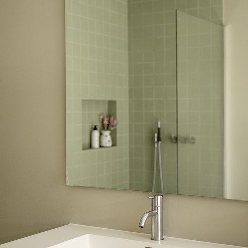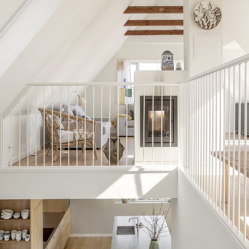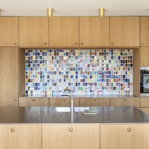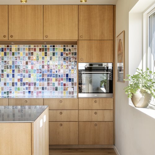 Indvendigt har vi haft fokus på at skabe de bedste rammer for familiens liv. Her har køkkenet fået hovedrollen i renoveringen, fordi det er her, familien tilbereder sine måltider og her, hvor dagen starter og slutter sammen. Køkkenet har fået en smuk detalje med gamle glaseringsprøver fra Royal Copenhagen og bringer dermed farve, liv og ikke mindst historie ind i boligen. En skøn personlig fortælling og en forfriskende kontrast til det ellers nedtonede og naturlige materialevalg.