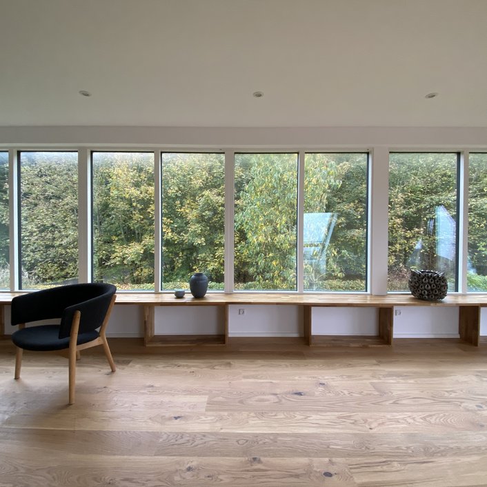 De oprindelige og eksisterende karaktertræk har arkitekten tænkt ind i renoveringen. Den eksisterende svalegang efterlader ”spor” i form af en ny stor karnap, som inviterer den naboliggende skov helt indenfor.