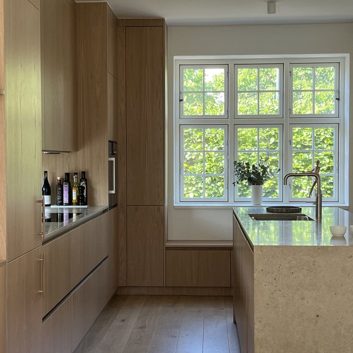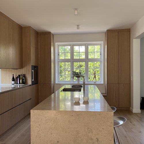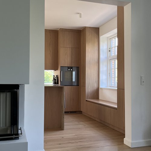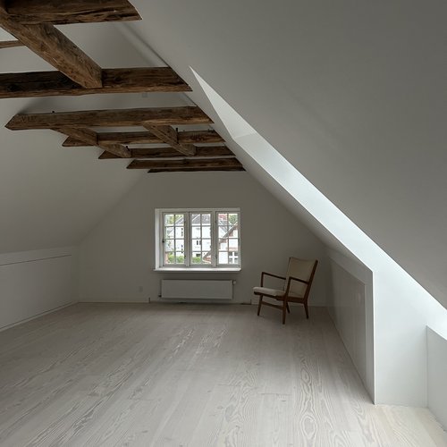 Husets arkitektoniske kvaliteter er bevaret; husets proportioner, planløsning og detaljer som fyldningsdøre og trappe står stadig intakte. Energiforbruget er væsentligt reduceret gennem indvendig isolering, nyt tag, nye vinduer og gulvopbygning med isolering og gulvvarme. Vi har valgt lokale materialer med lang levetid og naturlig patinering, og har stræbt efter en rolig og varm helhed, hvor nyt og gammelt mødes med nænsomhed.
