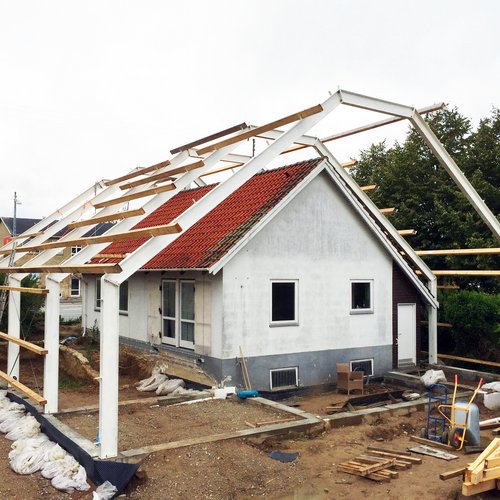 Det oprindelige hus er et betonbindingsværk med udvendig beklædning og indvendige halmisoleringspaneler (stramit). Betonbindingsværket gav os dog fleksibilitet til at kunne lave facadevinduer flere steder i facaden.