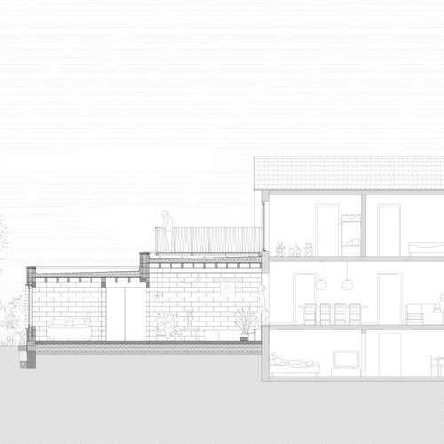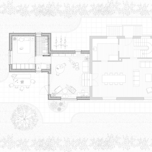 Projektet lægger sig til den eksisterende villa som en serie af rum, der kroger sig ud i haven. Det nye og det gamle flettes sammen og får tilføjet hjørner og nicher, der gør huset til en robust ramme for hverdagen. Flere generationer, der kan bo sammen, gammel og ung, hverdag og fest, fællesskab samt et sted, hvor man kan trække sig tilbage.