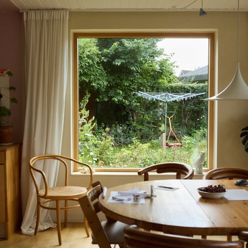 Stueetagen har vi bevaret næsten uændret, da både køkkenet og den åbne rumfordeling stadig fungerer godt. Vi har tilføjet et nyt vindue i gavlen, som inviterer dagslyset ind og giver kig til haven mod syd.