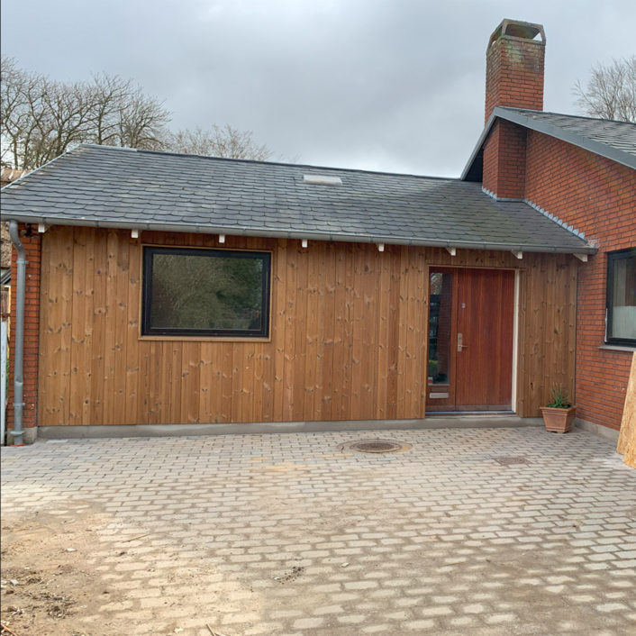 Huset er omdannet til en fleksibel énfamiliebolig med mulighed for fremtidig opdeling og udlejning. Tilbygningen matcher husets formsprog og er bygget i træ og eksisterende vægge.