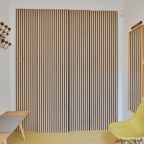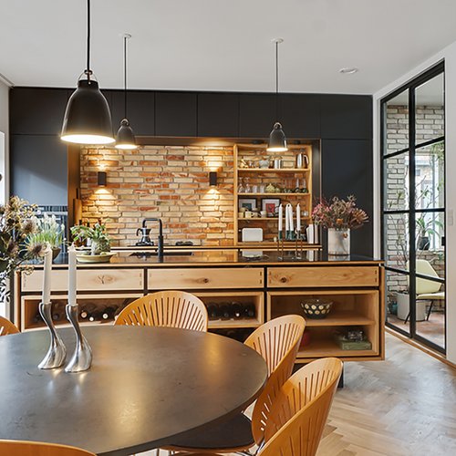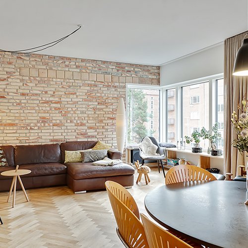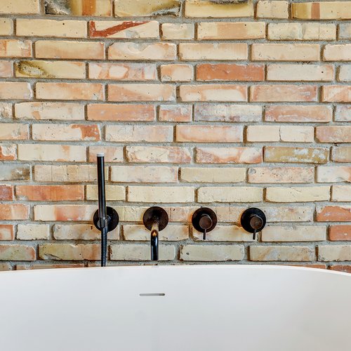 En del indvendige mure er renset af og står i de originale teglsten, dels for udtrykket og akustikken og dels for at kunne regul
