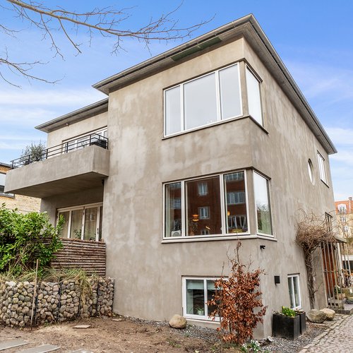 Funkishuset er tegnet af Alfred Mogensen i 1934 – den Alfred, der gennem 25 år var stadsarkitekt i Aarhus. Huset har i næsten 60 år tjent som lægeklinik og er nu gennemgribende ombygget til en moderne bolig for ejeren med keramikværksted i det gamle venteværelse, en lille gæstebolig og 2 små lejligheder til udlejning i konsultationen.