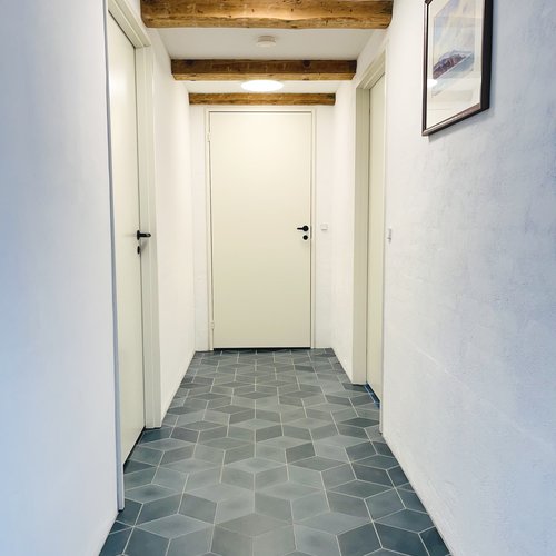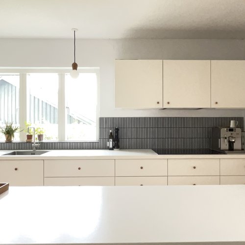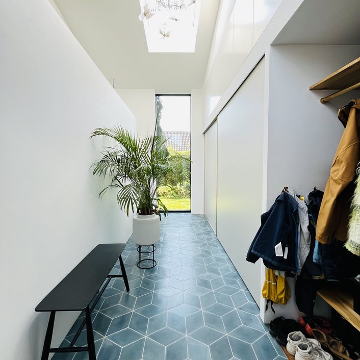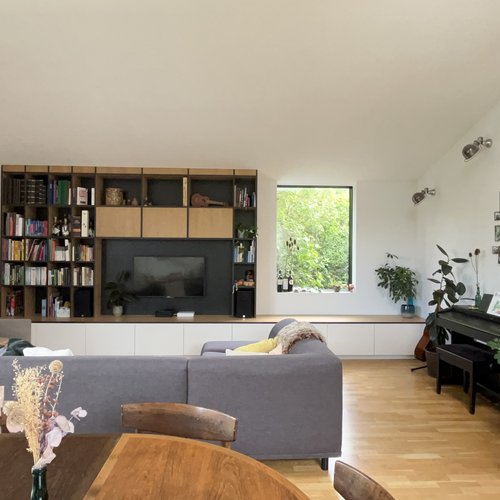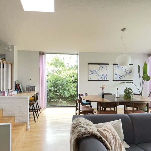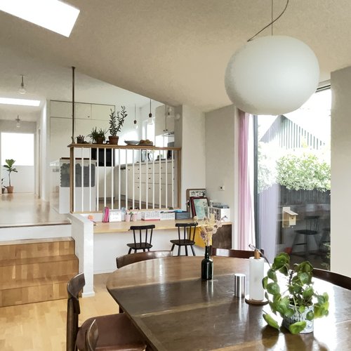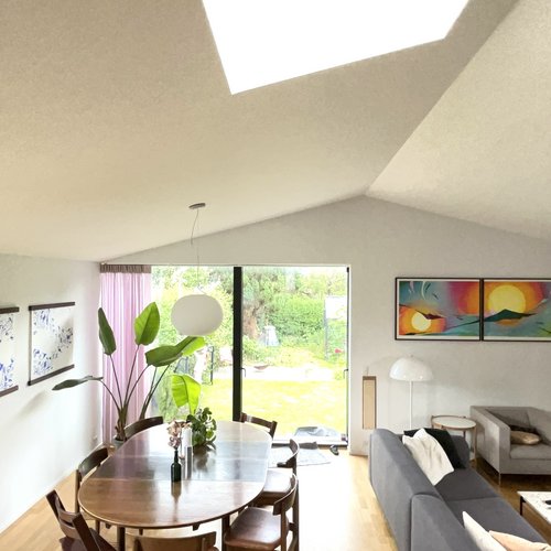 Den oprindelige bungalow er omdisponeret, og det samlede projekt opnår en rumlig rigdom skabt af simple greb som forskudte niveauer, kig, gennemlyste rum, semi-åbne sammenhænge og fleksibilitet.