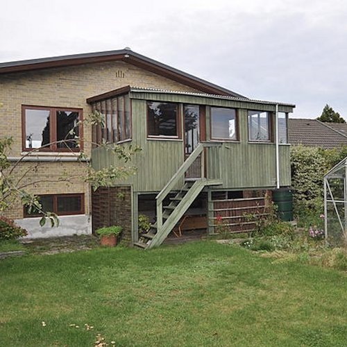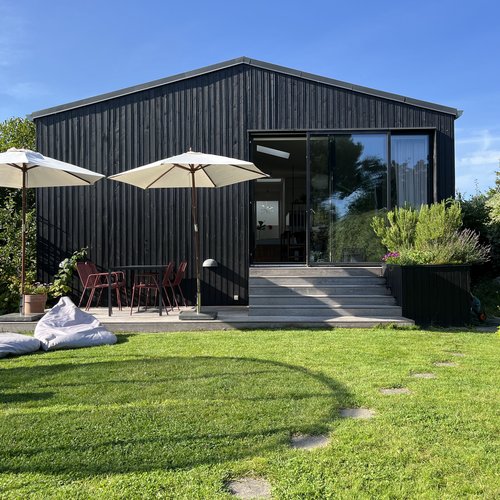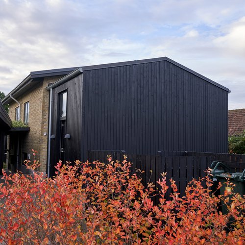 To tilbygninger underordner sig den centrale bungalow. Tilbygningerne er opført i en let trækonstruktion beklædt med Superwood. Bungalowen er blevet ført tilbage til sit oprindelige tagpaptag, murværket bevaret, og kælderen er opgraderet med isolering af både terrændæk og kælderydervægge samt decentral ventilation med varmegenvinding.