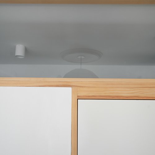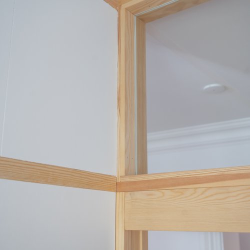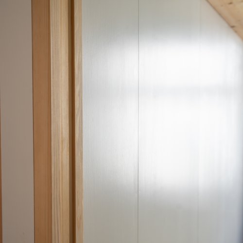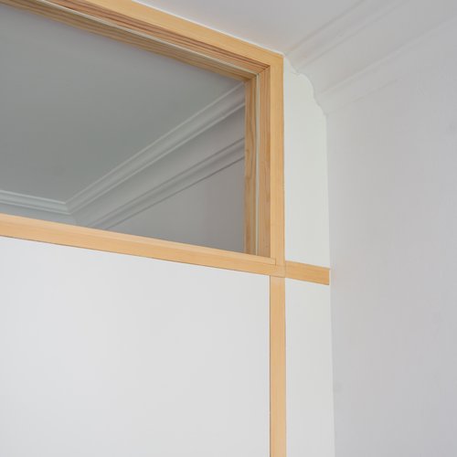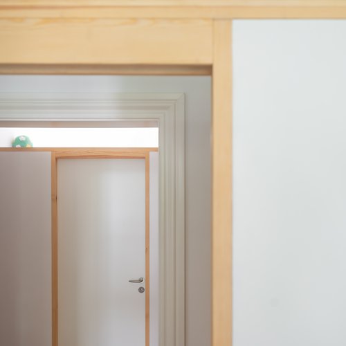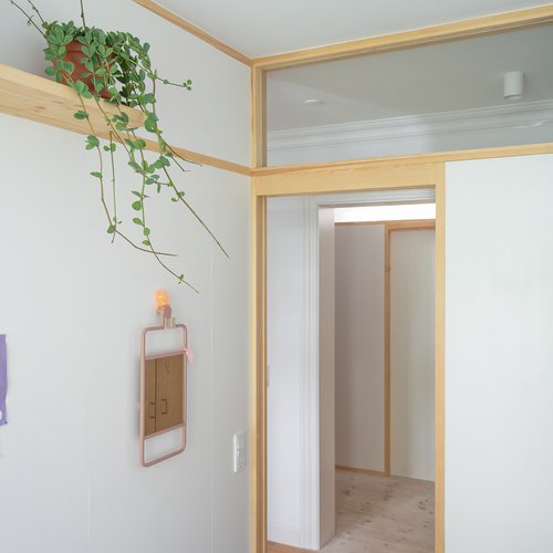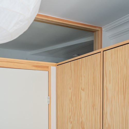 Vægsystemet er udført som et præfabrikeret, modulært byggesystem i fyrretræ med malede krydsfinerplader som overflade. Væggenes rammestruktur blev fremstillet på fabrik og efterfølgende opsat i lejligheden. De malede træoverflader tilfører en taktil materialitet og dybde til rummene. Resultatet er en hyperoptimeret børneafdeling, der balancerer det åbne og sociale med muligheden for ro og tilbagetrækning, hvor funktion og æstetik går hånd i hånd.