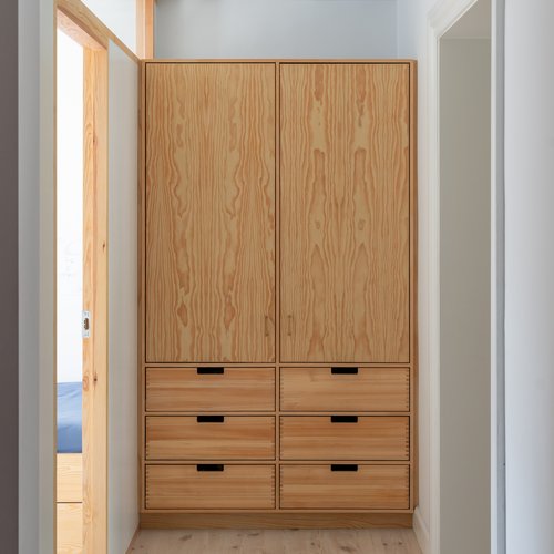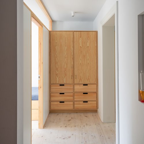 Lejlighedens nye planløsning viser på forbilledlig vis, hvordan fleksibel planlægning og gennemførte materialevalg kan skabe store forandringer på få m² og rum for både privatliv og funktionelle fællesrum. Det er enkelt, ærligt og overbevisende. Med brug af de præfabrikerede moduler er det nemt at ændre og tilpasse boligen, fx når børnene flytter hjemmefra, og samtidig skaber modulerne sammen med indbygget inventar visuel ro og sammenhæng.