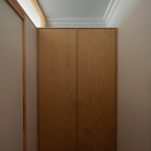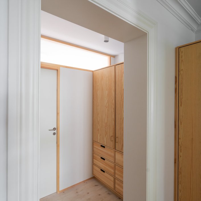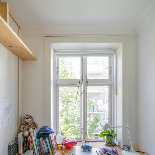 Hovedfokus i dette projekt på Frederiksberg har været at optimere lejlighedens layout for at imødekomme et højere niveau af privatliv for de fem beboere - Uden at gå på kompromis med de rumlige kvaliteter. Familien stod med valget mellem at flytte ud af byen eller at blive og optimere rammerne for deres dagligdag. Familiens 3 børn var nået en alder, hvor de havde behov for et sted at trække sig tilbage. Der var derfor behov for forskellige muligheder og grader af samvær og privatliv. Projektet viser at små rum ikke behøver være hverken kedelige eller blottede for rumlige kvaliteter. Der er både spændende lyssituationer, taktile materialer og velproportionerede elementer på spil i børnenes værelser.
