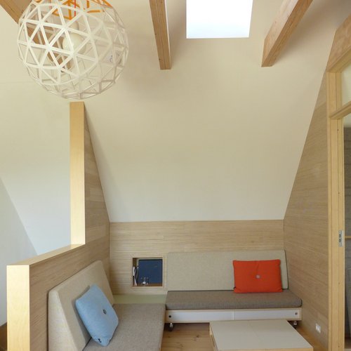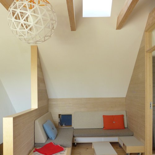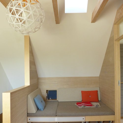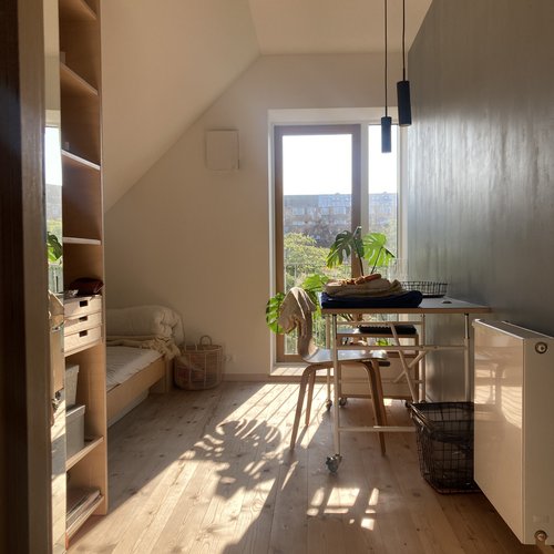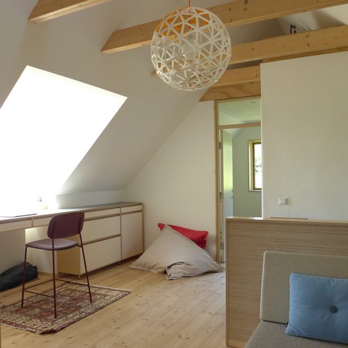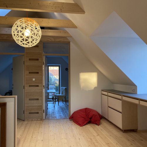 På første sal blev det centrale fællesrum skabt med lys fra en sydvendt kvist og der blev åbnet til kip. Kun badeværelset på 1. sal blev bevaret, mens hele styuplan står uændret.
