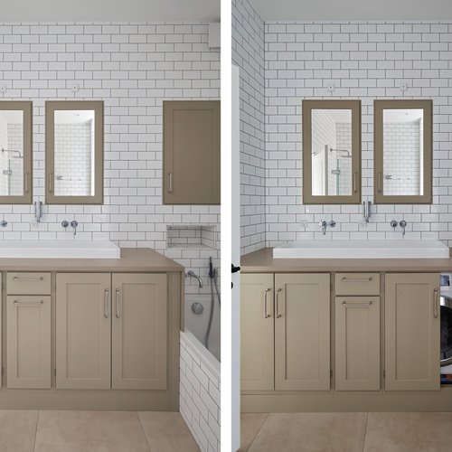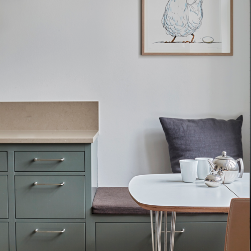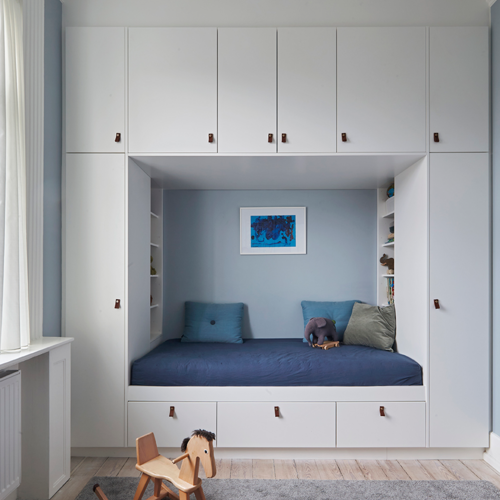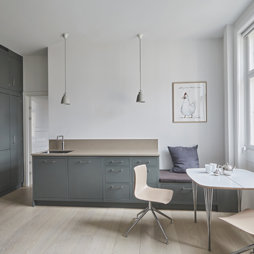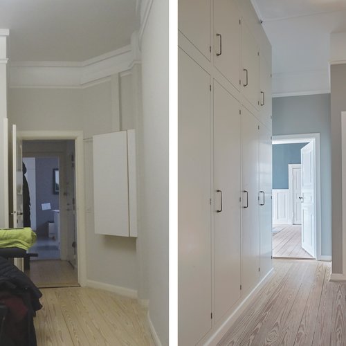 Opbevaring er integreret i boligens planløsning. Snedkerlavede gulv til loft-skabe og indbyggede møbler i entré, badeværelse og stuer er udført i høj kvalitet og tilpasset lejligheden. Nicher og kroge er inddraget som aktive opholdsrum. Bevaring og genskabelse af historiske detaljer skaber ikke kun et smukt og stemningsfuldt hjem, men er også en værdifuld måde at videreføre vores bygningskultur på.