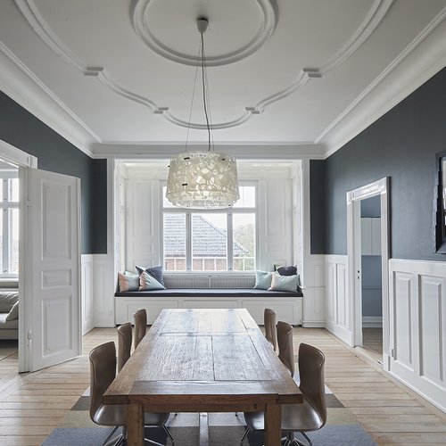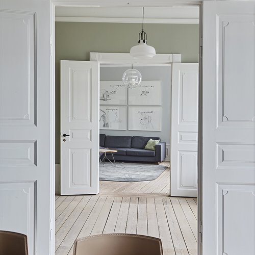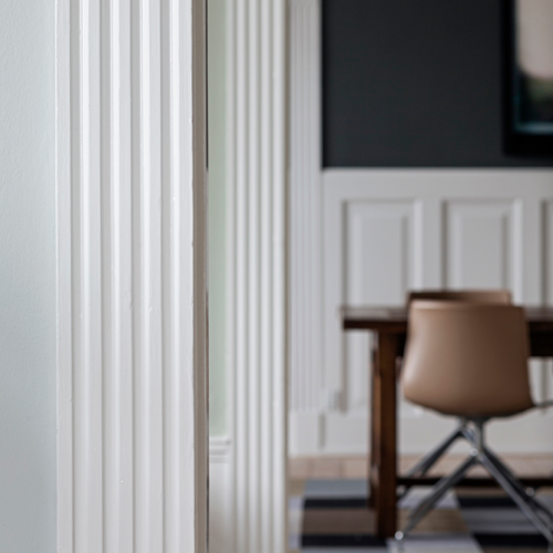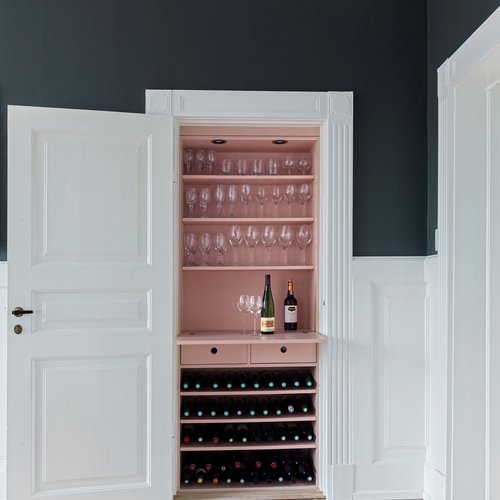 Samtidig blev lejlighedens oprindelige detaljer som fyldningsdøre, høje paneler, indfatninger og stuk nænsomt renoveret eller genskabt af snedker. Et eksempel er spisestuen, hvor en døråbning er blændet. For at bevare symmetrien i stuen lod vi døren blive, selvom der var blændet bagved. I dør-nichen fik vi udført et vin- og barskab.