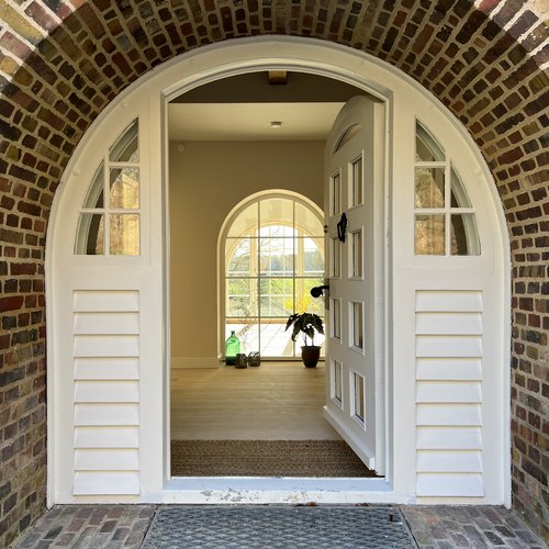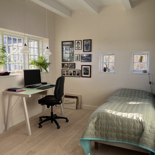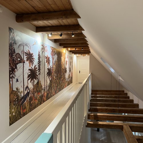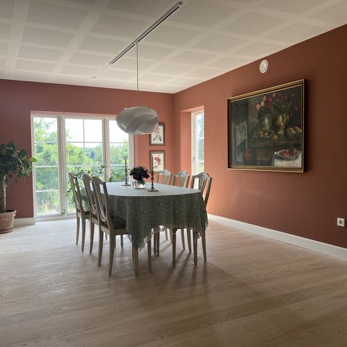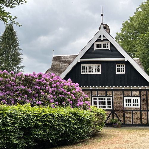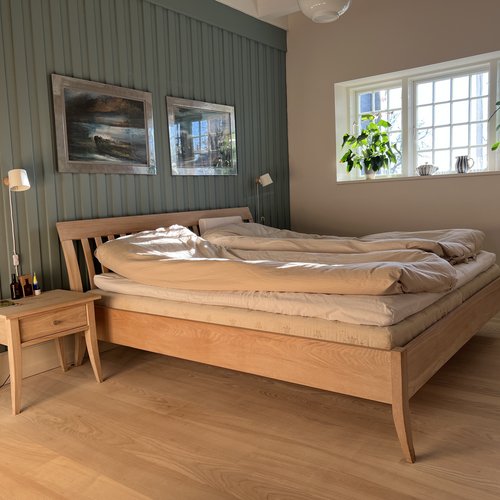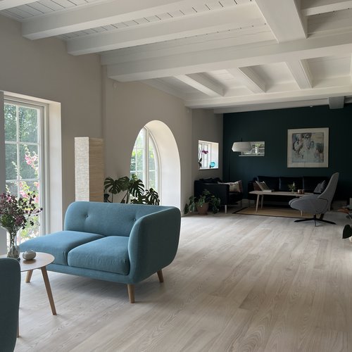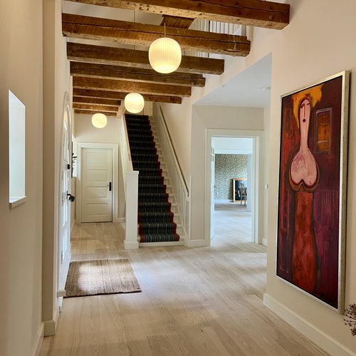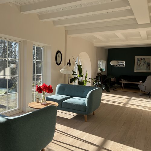 Det er et hjem med moderne komfort, hvor også man bliver mødt af en hall med blotlagte bjælker, et kig gennem husets akse og et smukt bjælkeloft i stuen.