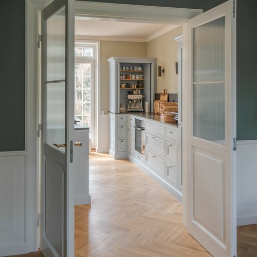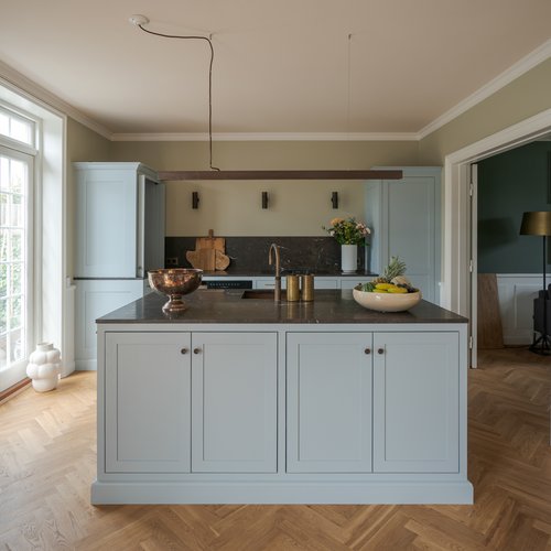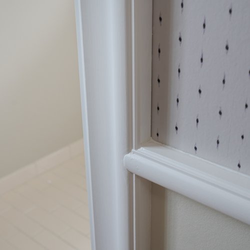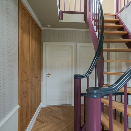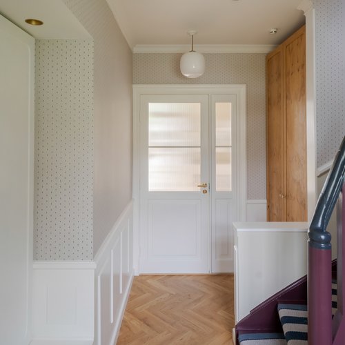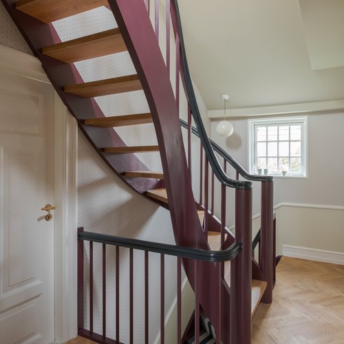 Indfatninger, paneler og lister m.m. er, med afsæt i de oprindelige bygningsdele, blevet genfortolket og udført herefter.