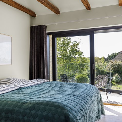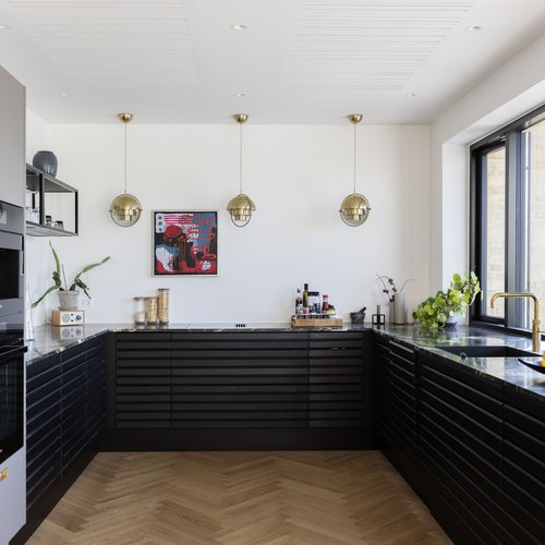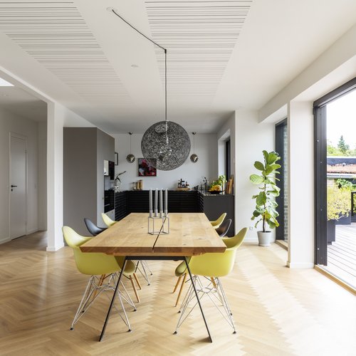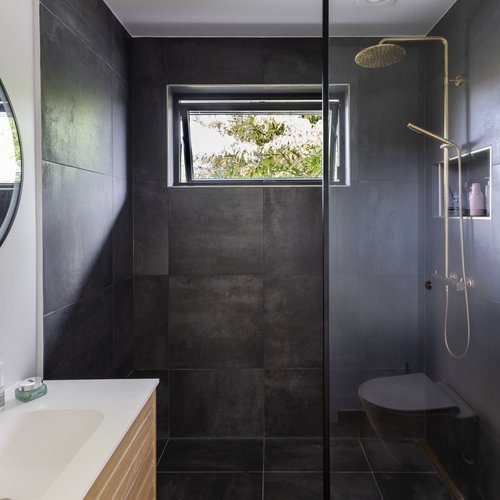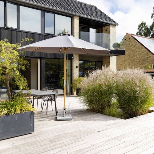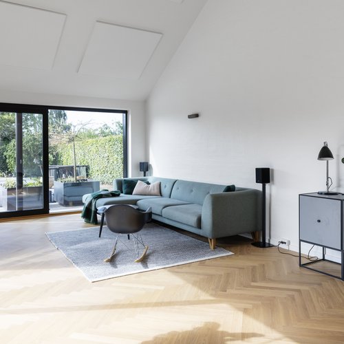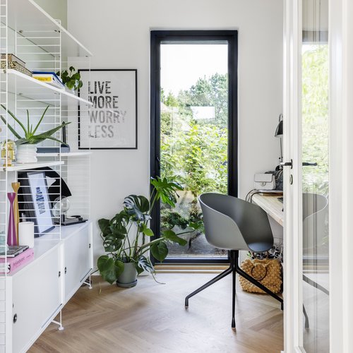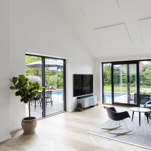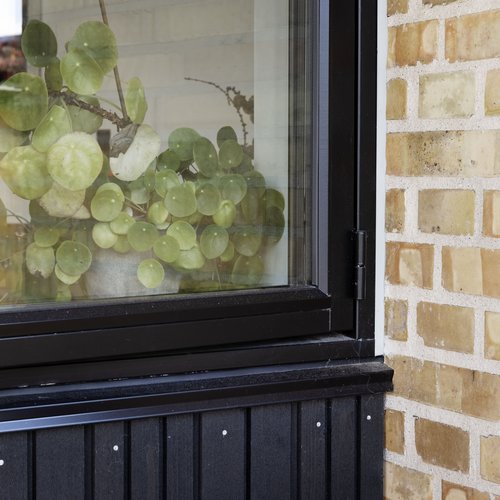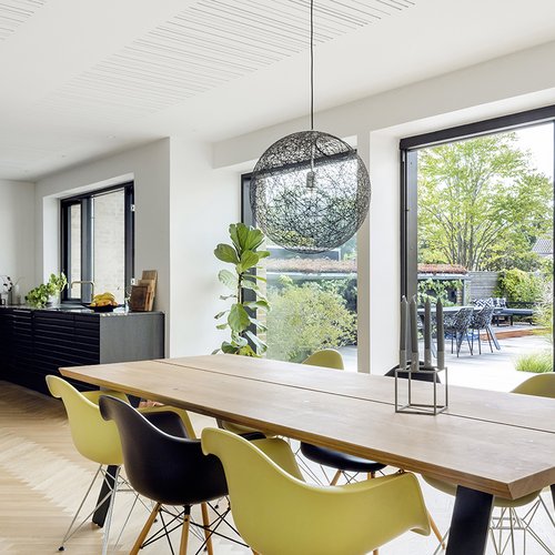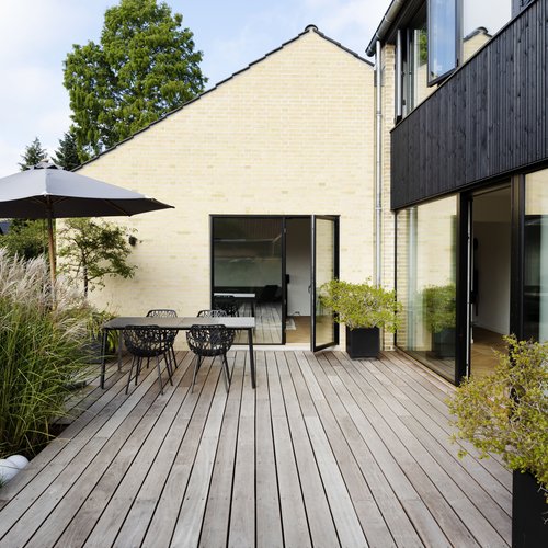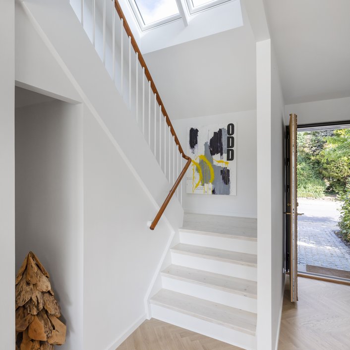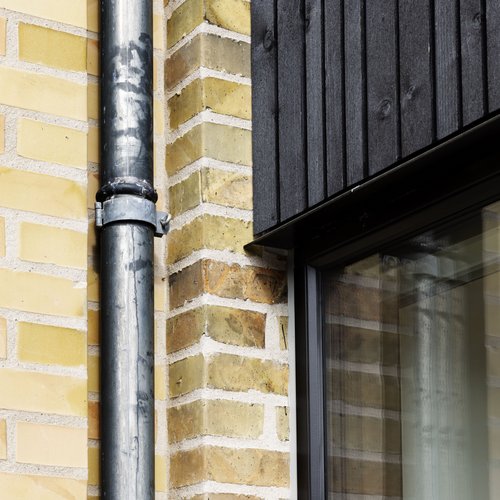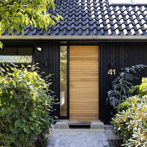 Projektet bevarer de væsentlige arkitektoniske principper fra 1950’erne – de gule mursten er omfuget, de lette facadepartier er udskiftet fra eternit til sortmalet træbeklædning og større, energieffektive vinduespartier. Planløsningen er åbnet op mod haven, og den eksisterende tilbygning er gentænkt, så den nu harmonerer med huset i sin helhed. Tag, facader og terrændæk er efterisoleret; i stueetagen og udvalgte rum på 1. sal er der indlagt vandbåren gulvvarme. Nye 3‑lags lavenergiruder og højisolerede ovenlysvinduer sænker varmetabet yderligere og øger dagslyset.