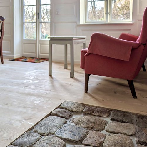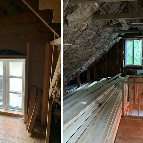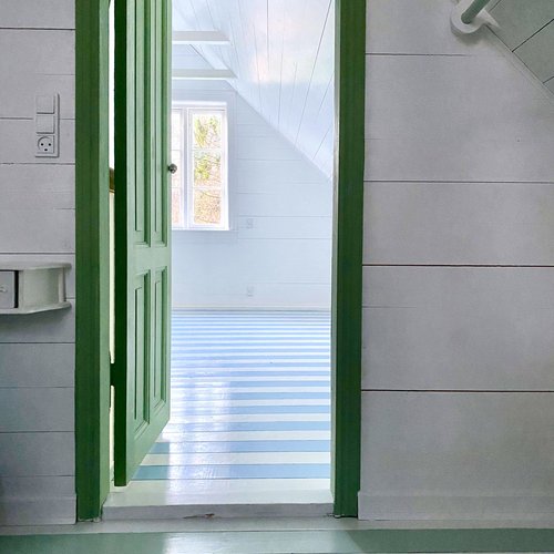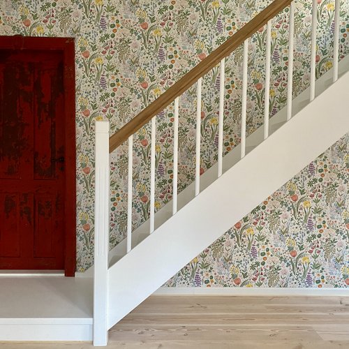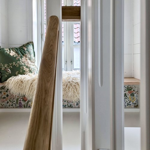 Den ikke-originale trappe, er udskiftet for at optimere ankomstforholdene til førstesalen. Man har etableret en mellemrepos som fremstår i korrekt højde i forhold til det eksisterende vindue, med plads til en hyggekrog og udsigt til hovedhuset. Det giver et behageligt flow og nærhed mellem oppe og nede.