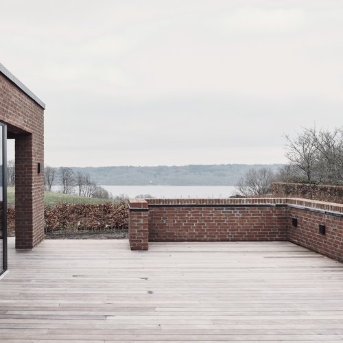 På siden af huset blev der anlagt en skøn terrassen mod syd vest hvorfra udsigten og solen kan nydes det meste af dagen.